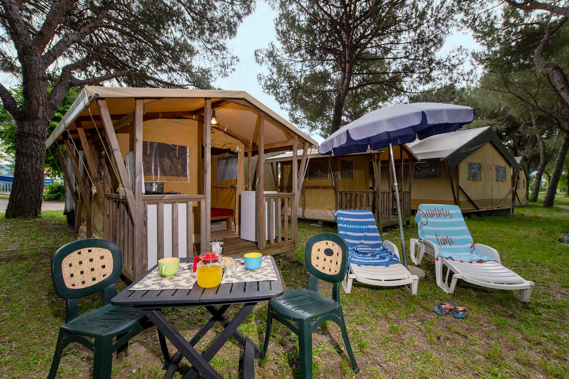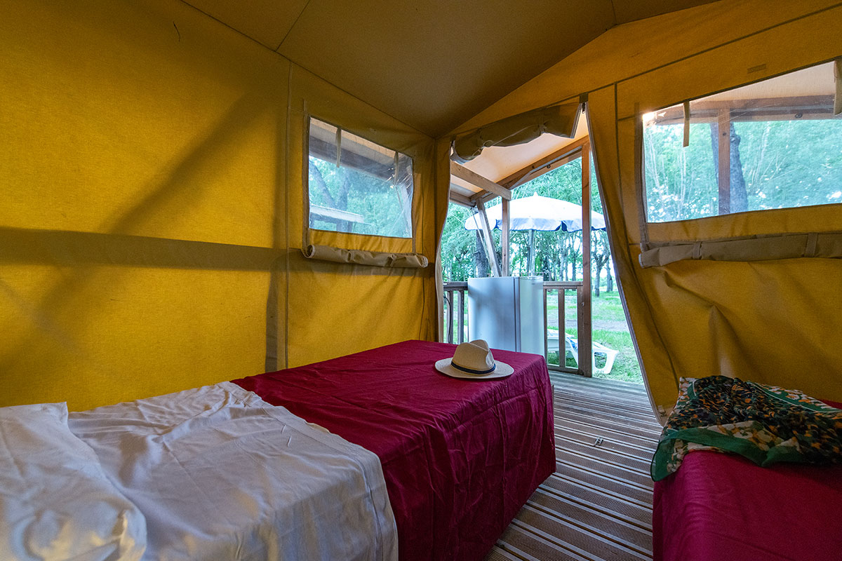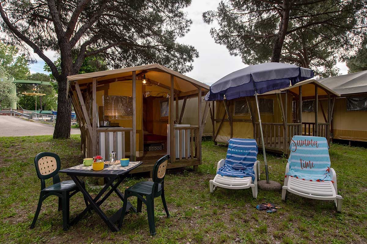 Le nostre nuovissime mini Glamping vista lago per 2 persone, con 1 camera con due letti, 1 angolo cottura e una veranda in legno con mobili da giardino tra cui 1 tavolo con sedie, 2 sdraie e 1 ombrellone.